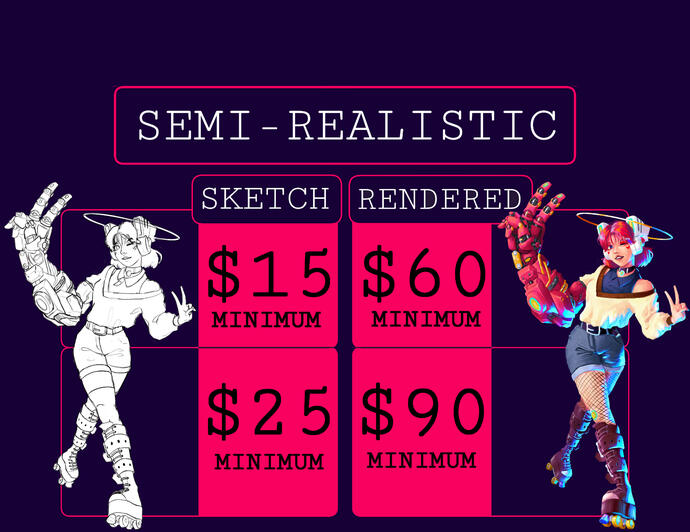 Extremely detailed characters (mechas, armors etc.) are approximately 2x the price, depending on the complexity.